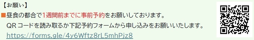 お昼の都合で1週間前までに事前予約をお願いしております。QRコードまたはフォームから申し込みをお願いいたします。